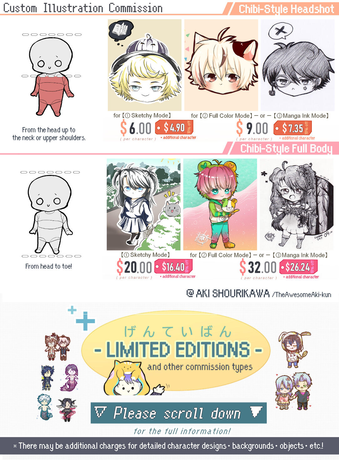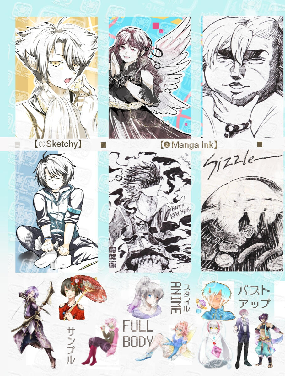 (Anime / Manga・Chibi / Boop・Pixel ) / (Sketchy / Colored / Manga)② Commission details: (Just a regular headshot, half body, full body illustration, or is it mixed to