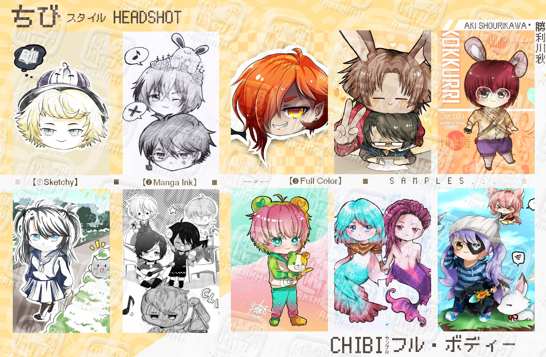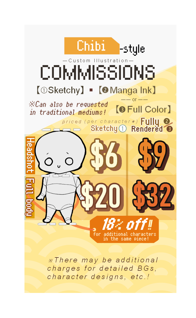 ◆ FULLY RENDERED Chibi-style headshot ($9)・full body ($32) character illustration◆ Non-character illustration (custom pricing; varies on request)
