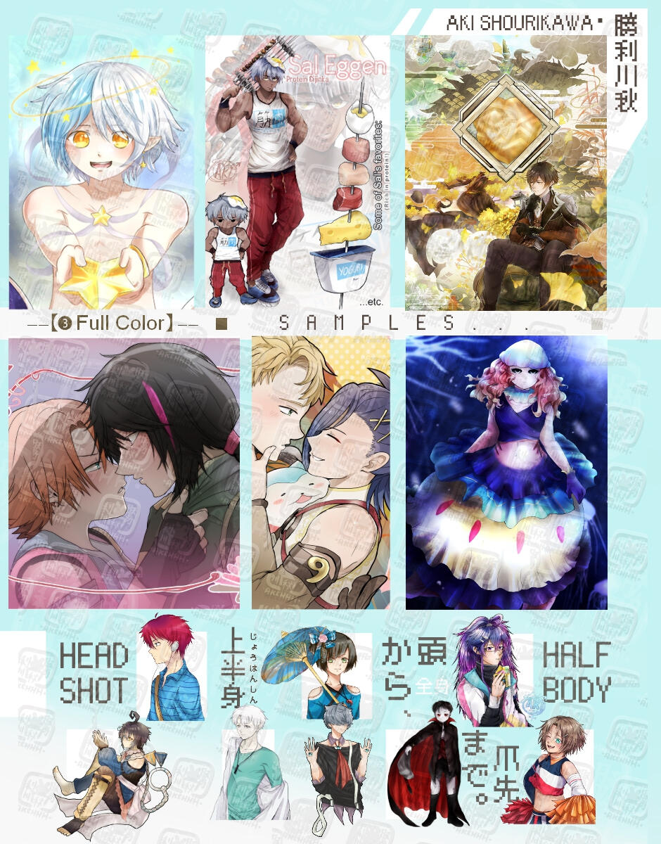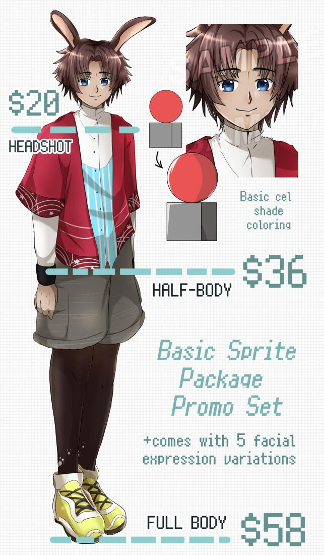 w/ x2 outfit variants, x2 prop/weapon/items, x3 view profiles ($18~$26+)◆SKETCHY Anime-style headshot ($12)・half body ($25)・full body ($45) character illustration