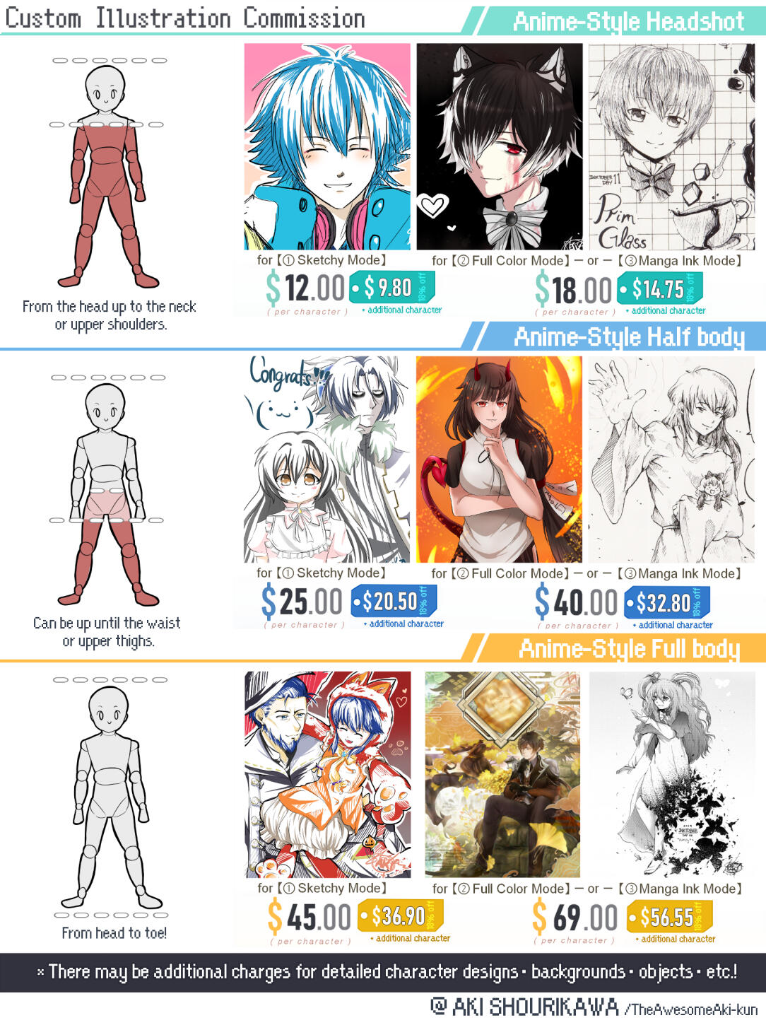 There is a standard rate set for ➀The type of drawing style and mode, ➁How many characters, ➂and Up to what body part will be drawn, as well as a default discount of 18% off for multiple characters drawn together in a single artwork!