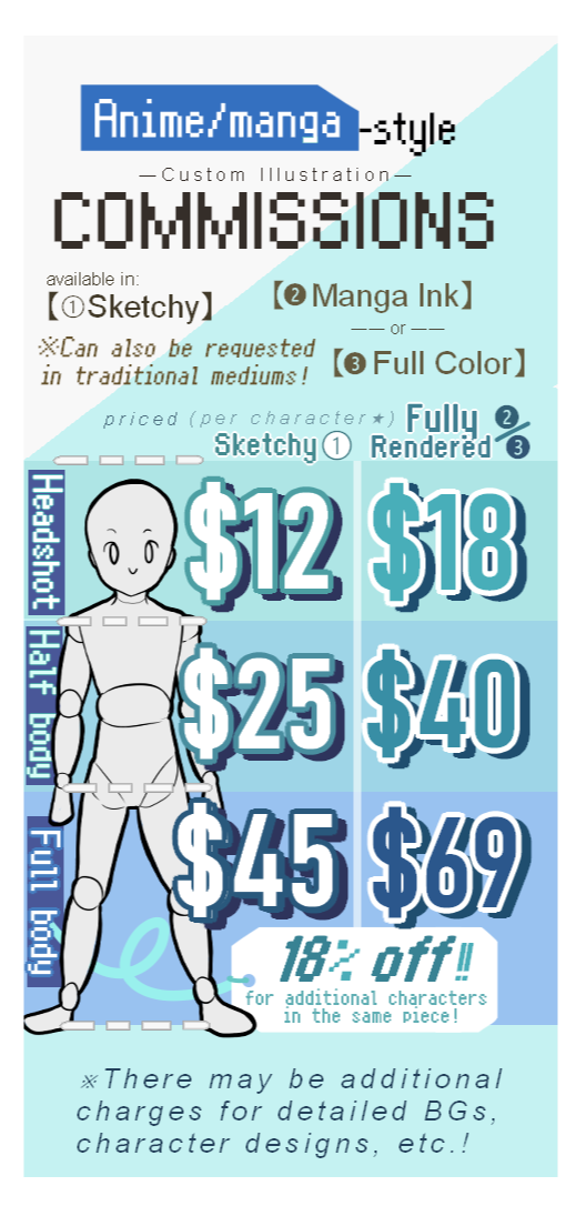 - - - - - - - - - - - - - - - - - - - -Generally priced per number of characters, by part (headshot, half, and full body).