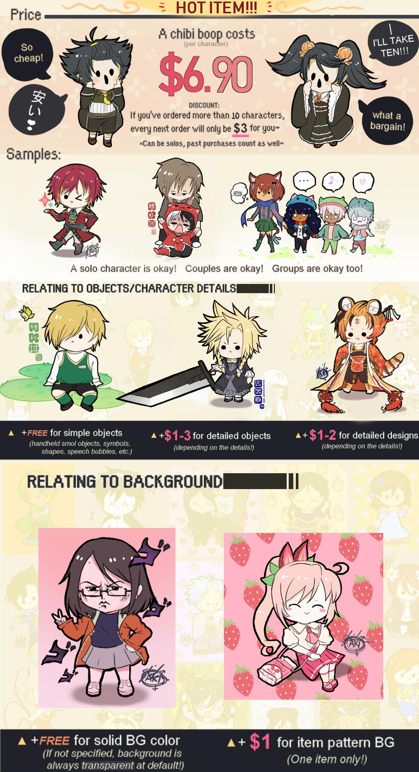 For detailed character designs/objects/backgrounds that will take longer for me to draw, there may be *additional fees. These will be immediately brought up and discussed within the ordering and the rough sketch time period, and can be compromised / haggled upon further discussion.